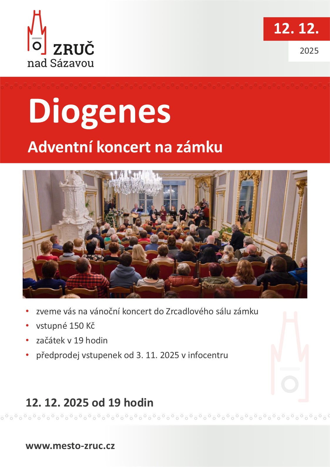 Adventní koncert skupiny Diogenes je uskuteční 12.12.2025 od 19 hodin v Zrcadlovém sále zámku. Předprodej od 1.11.2025 v infocentru (601 231 214) Plakát.