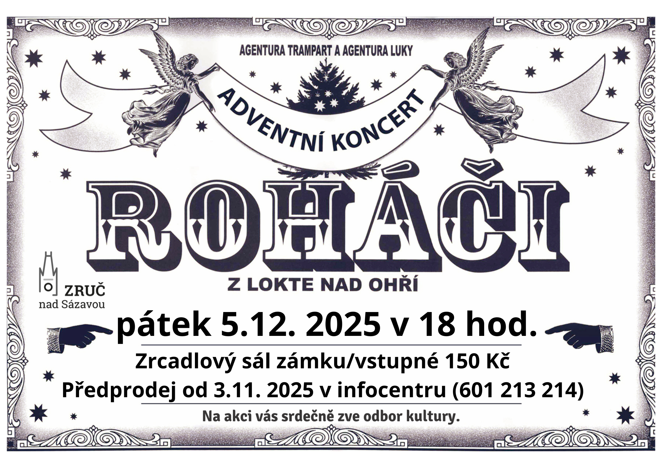 Oblíbený předvánoční koncert skupiny Roháči z Lokte, se uskuteční 5.12.2025 od 18 hodin v Zrcadlovém sále zámku. Předprodej od 3.11.2025 v infocentru ( 601 213 214) Plakát.