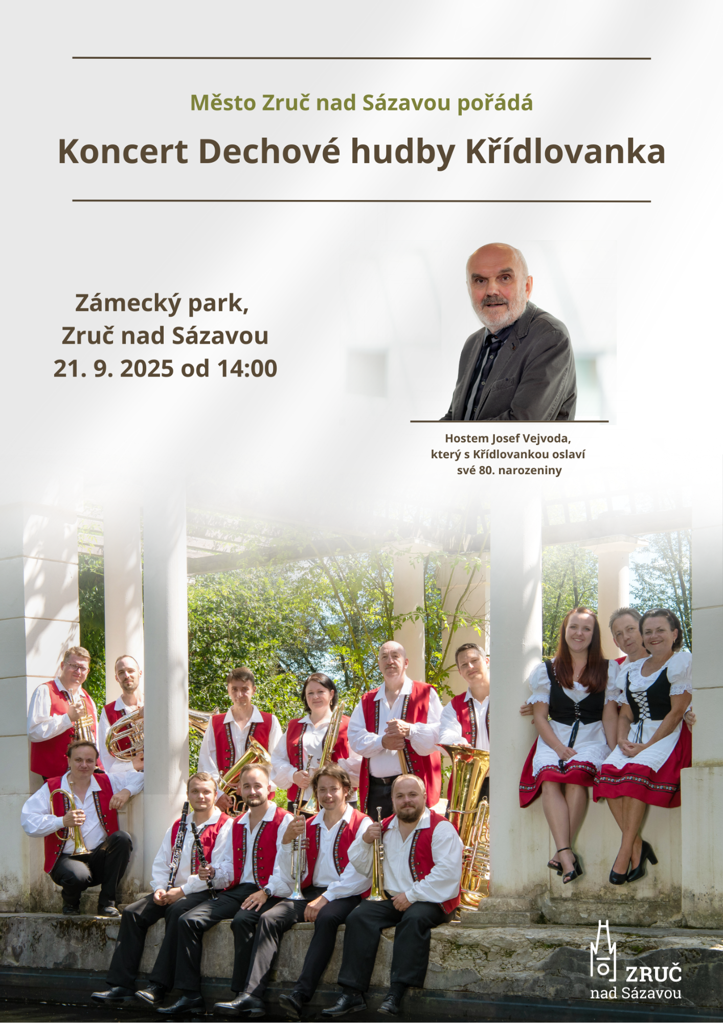 V zámeckém parku se uskuteční koncert dechové kapely Křídlovanka. Jako host vystoupí Josef Vejvoda. Začátek akce 21.9.2025 ve 14 hodin. Vstupné zdarma.