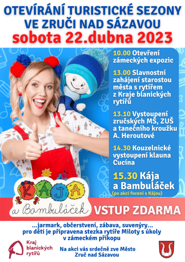 Otevírání turistické sezony, proběhlo v sobotu 22.4.2023 od 10 hodin v zámeckém parku. Zajištěn byl bohatý program pro děti i dospělé . Hlavním lákadlem pro děti bylo oblíbené duo Kája a Bambuláček i klaun Cucíno, se kterým si děti užily spousty legrace.. Vstup zdarma. Plakát.