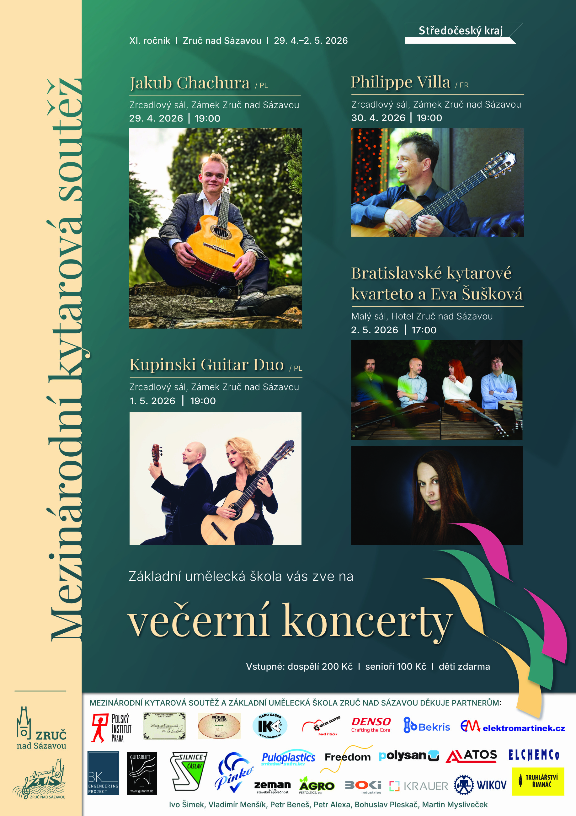 Večerní koncerty, na které bychom rádi pozvali širokou veřejnost, nabídnou posluchačům skutečné hudební lahůdky. Po zahajovacím koncertu ve středu 29. dubna v podání polského kytaristy Jakuba Chachury, minulého laureáta soutěže, vystoupí ve čtvrtek 30. dubna francouzský virtuóz Philippe Villa, který představí ryze romantický program převážně francouzských skladatelů. O den později, tedy v pátek 1. května se publiku představí světoznámé polské kytarové Duo Kupinski. Program se tentokrát ponese v duchu původně polského tance Mazurky. První tři výše zmíněné koncerty se uskuteční vždy od 19:00 v Zrcadlovém sálu Zručského zámku.