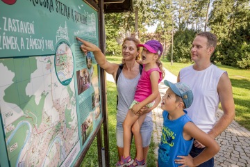 Na každém ze 14ti panelů najdete spoustu informací o zámku, parku i historii Zruče. U každého zastavení psí slečna Dalili položí dětem zajímavý úkol. Stezka je doplněna hmatovým chodníčkem pro děti. Nacházejí se zde i dobové snímky zámku i popisky vzácných stromů.